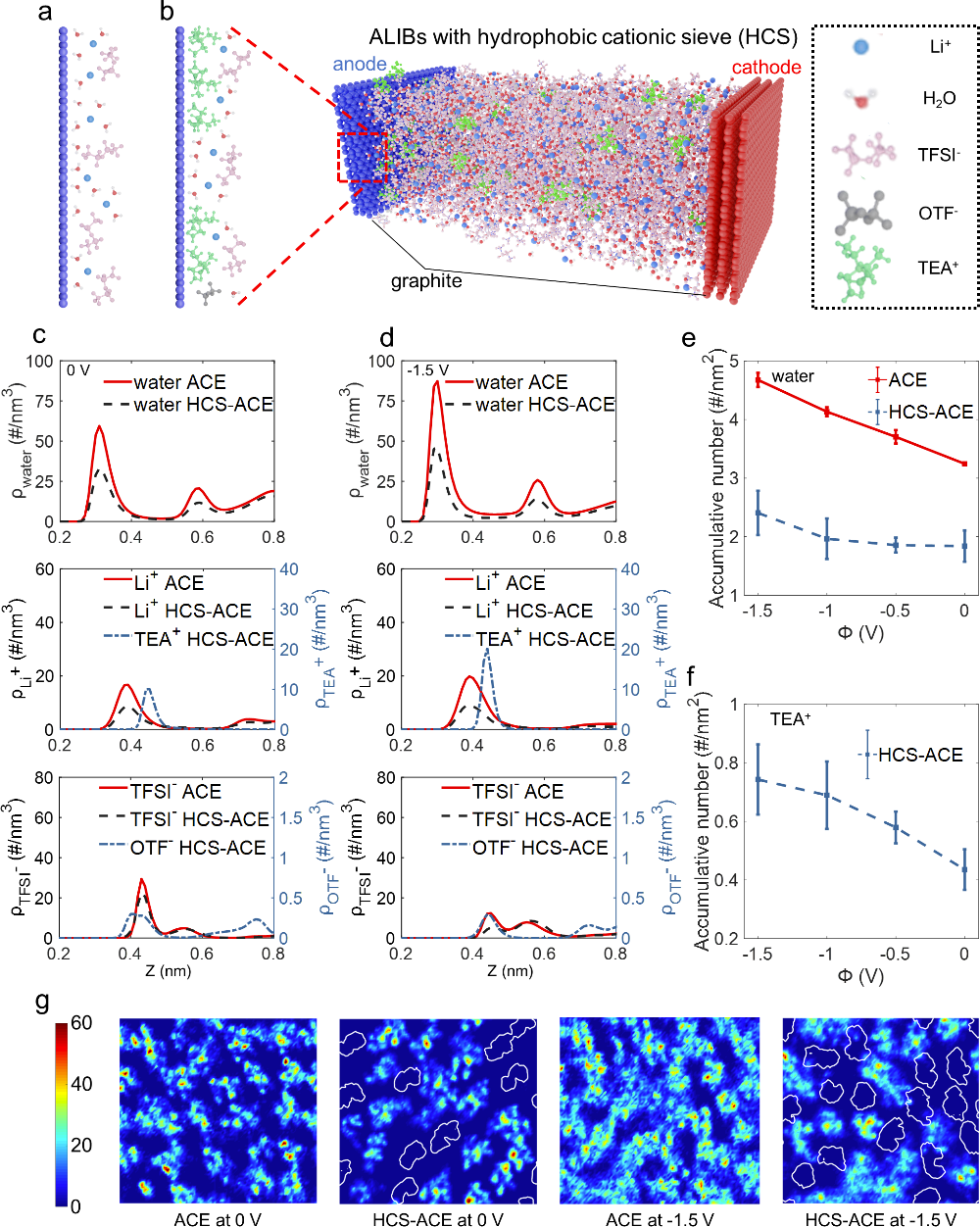 圖1. (a)沒有HCS的負(fù)極界面結(jié)構(gòu)。(b)含有HCS的分子動(dòng)力學(xué)模擬結(jié)果,以及含有HCS的負(fù)極界面結(jié)構(gòu)。在0 V (c) 和-1.5 V(d) 時(shí)水分子(頂部),陽離子(中間),陰離子(底部)的數(shù)密度圖。(e)在HCS-ACE和ACE兩個(gè)系統(tǒng)中,負(fù)極界面水分子電吸附的情況。(f)在HCS-ACE系統(tǒng)中TEA+陽離子電吸附的情況。g)在負(fù)極界面水分子二維分布的情況,白色輪廓代表TEA+的位置。