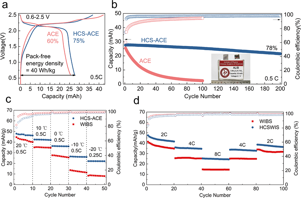 圖2. (a) 不同電解液下mAh級別軟包電池的首周充放電曲線,庫倫效率以及能量密度(HCS-ACE與ACE)。 (b) mAh級別的軟包電池在ACE和HCS-ACE電解液下的循環(huán)性能。(c) HCS-ACE與高濃度水系電解液的全電池低溫性能對比。(d)HCS-ACE與高濃度水系電解液的倍率性能對比。