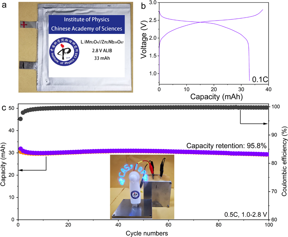 圖4. 33 mAh容量LiMn2O4//Zn2Nb34O87軟包電池電化學(xué)性能